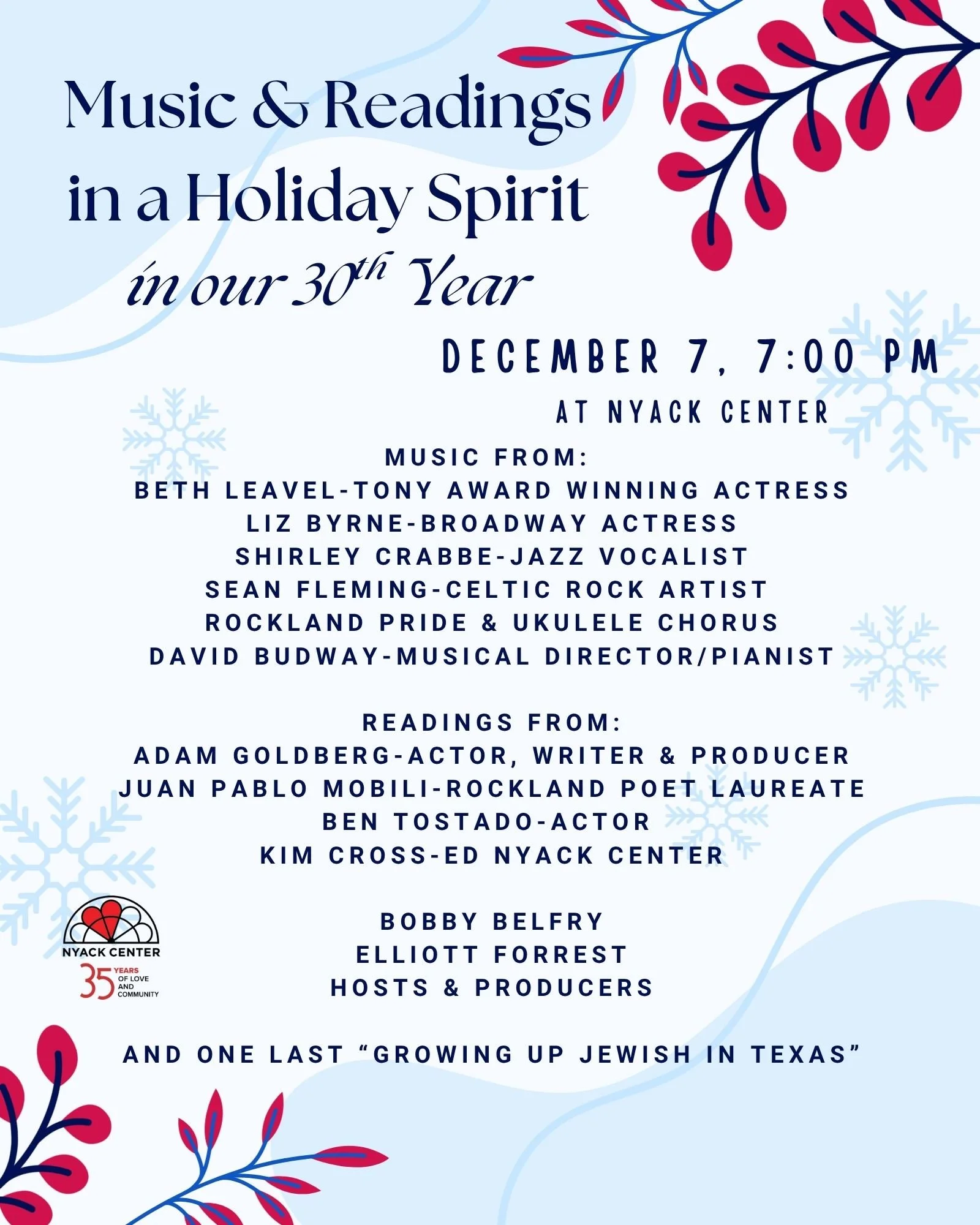 Join us for Nyack Center’s 30th Annual Music & Readings in a Holiday Spirit—a beloved tradition of joy, generosity, and togetherness.